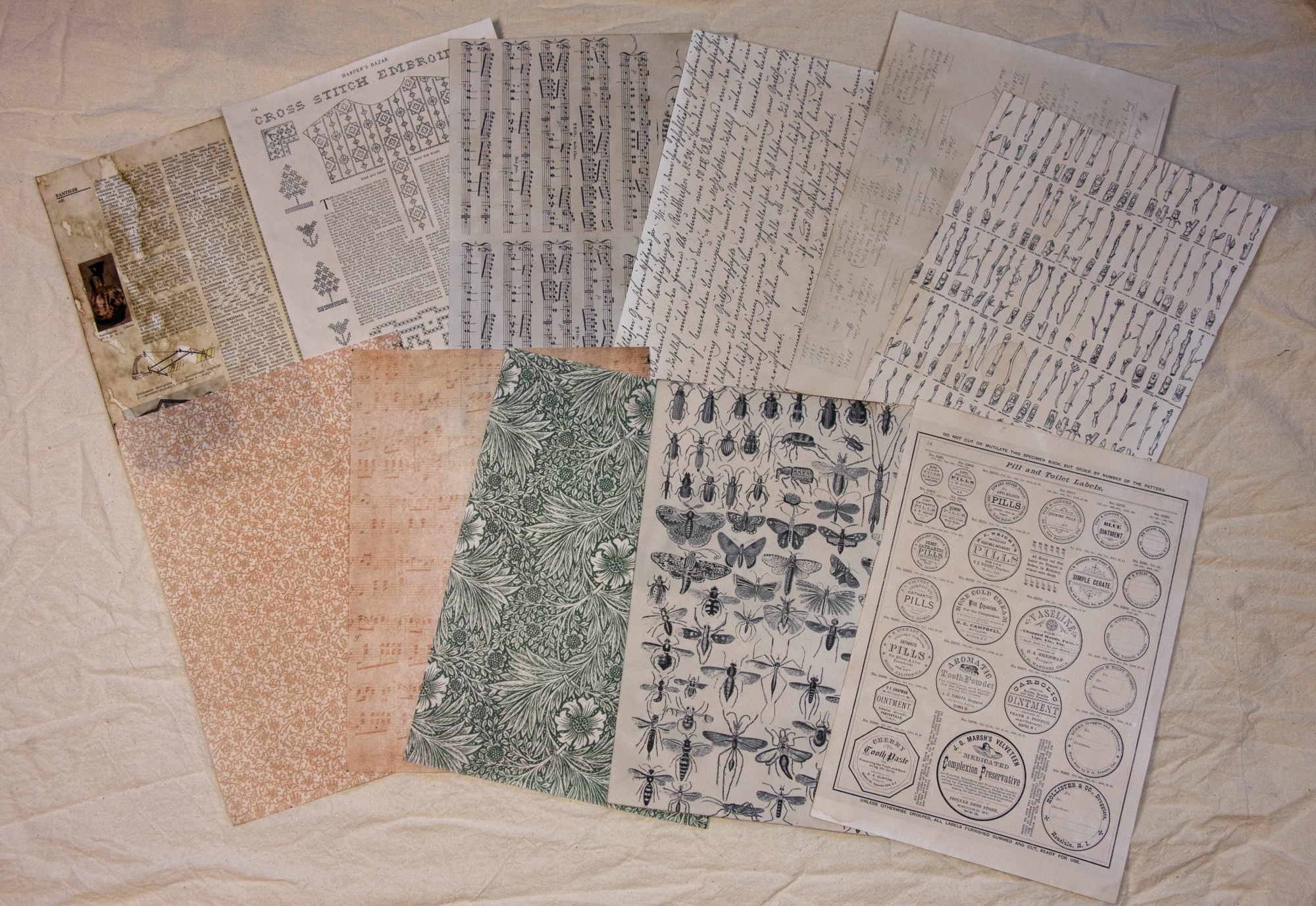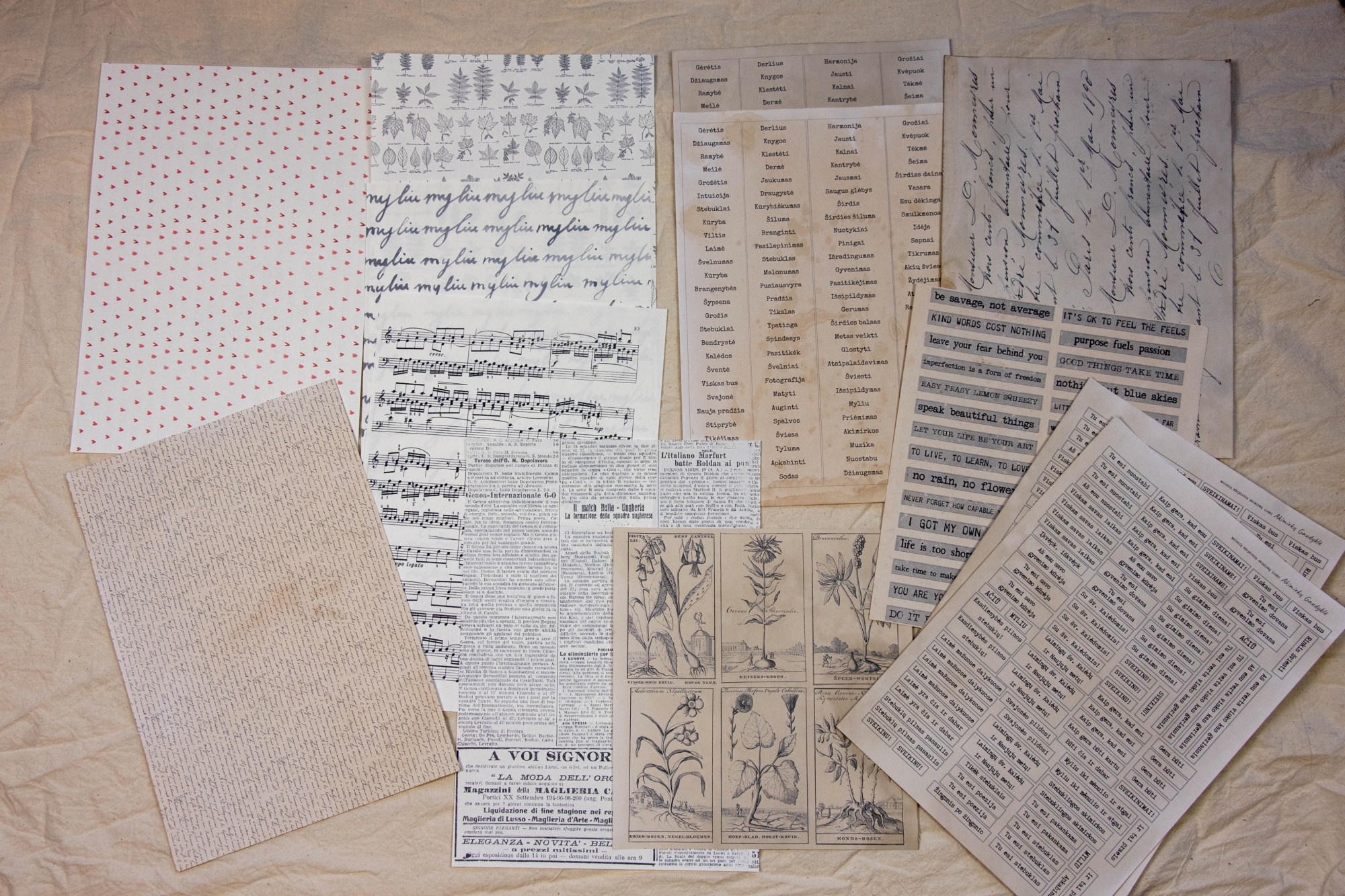 Dalis lapų sendinti kava. Įvairių rūšių, storių lapuose spausdintos iliustracijos ir tekstai iš atvirų archyvų, mano skenuoti ir maketuoti lapai.