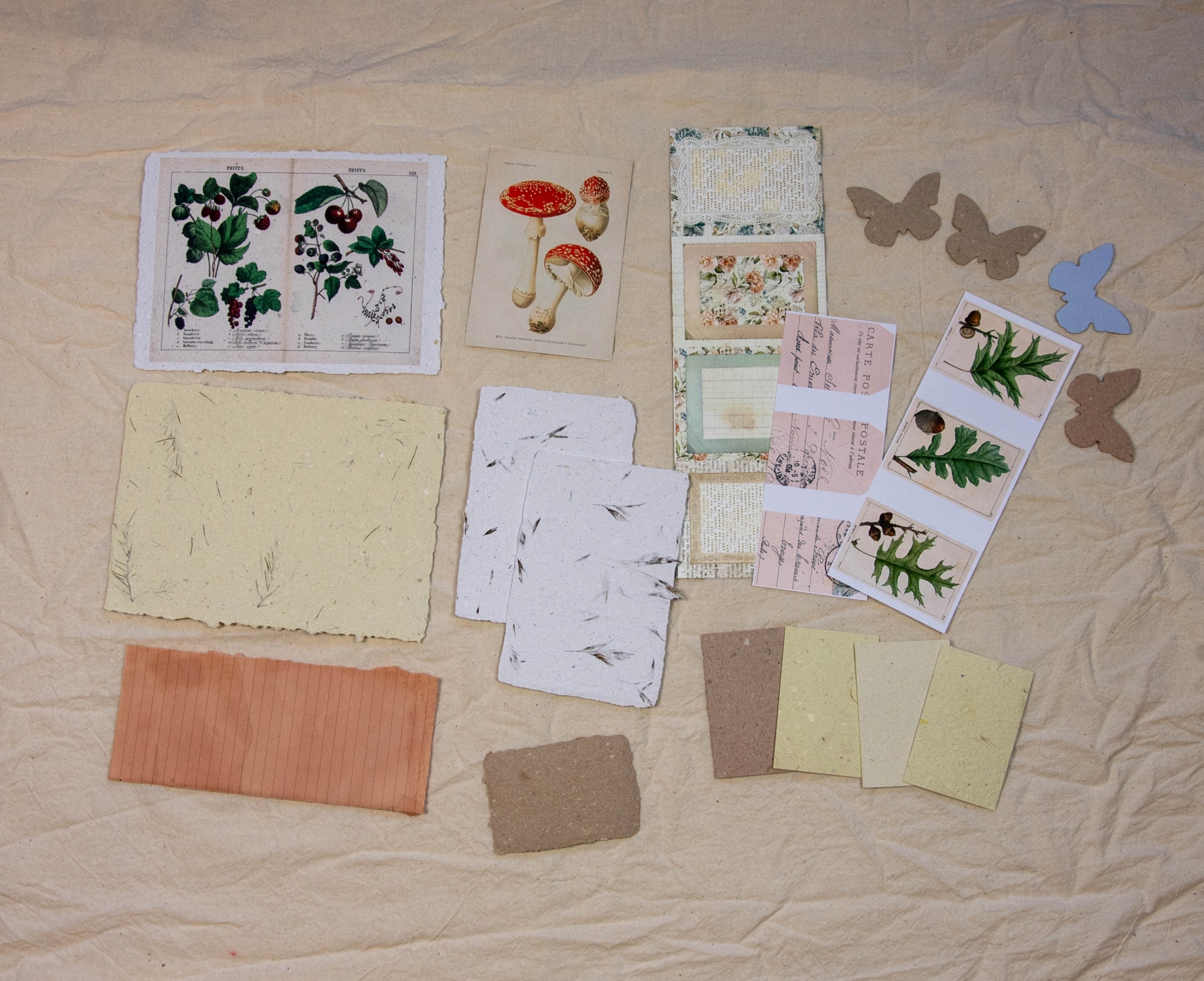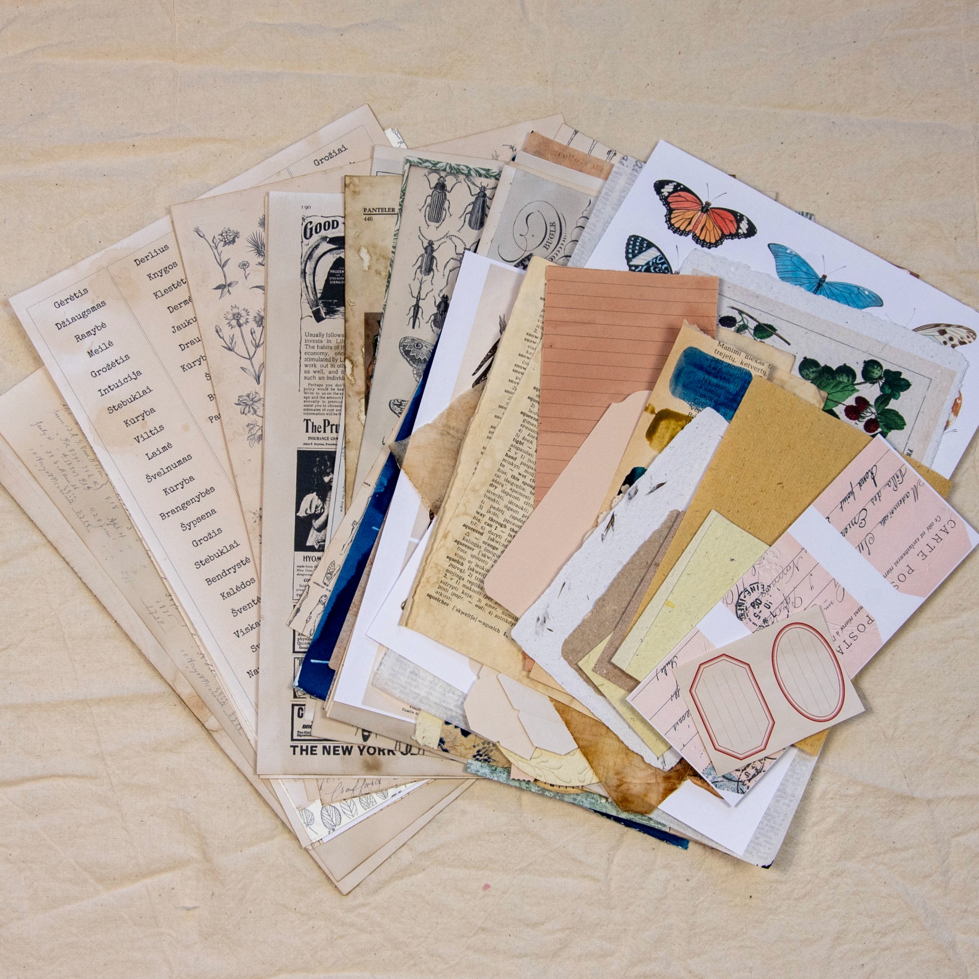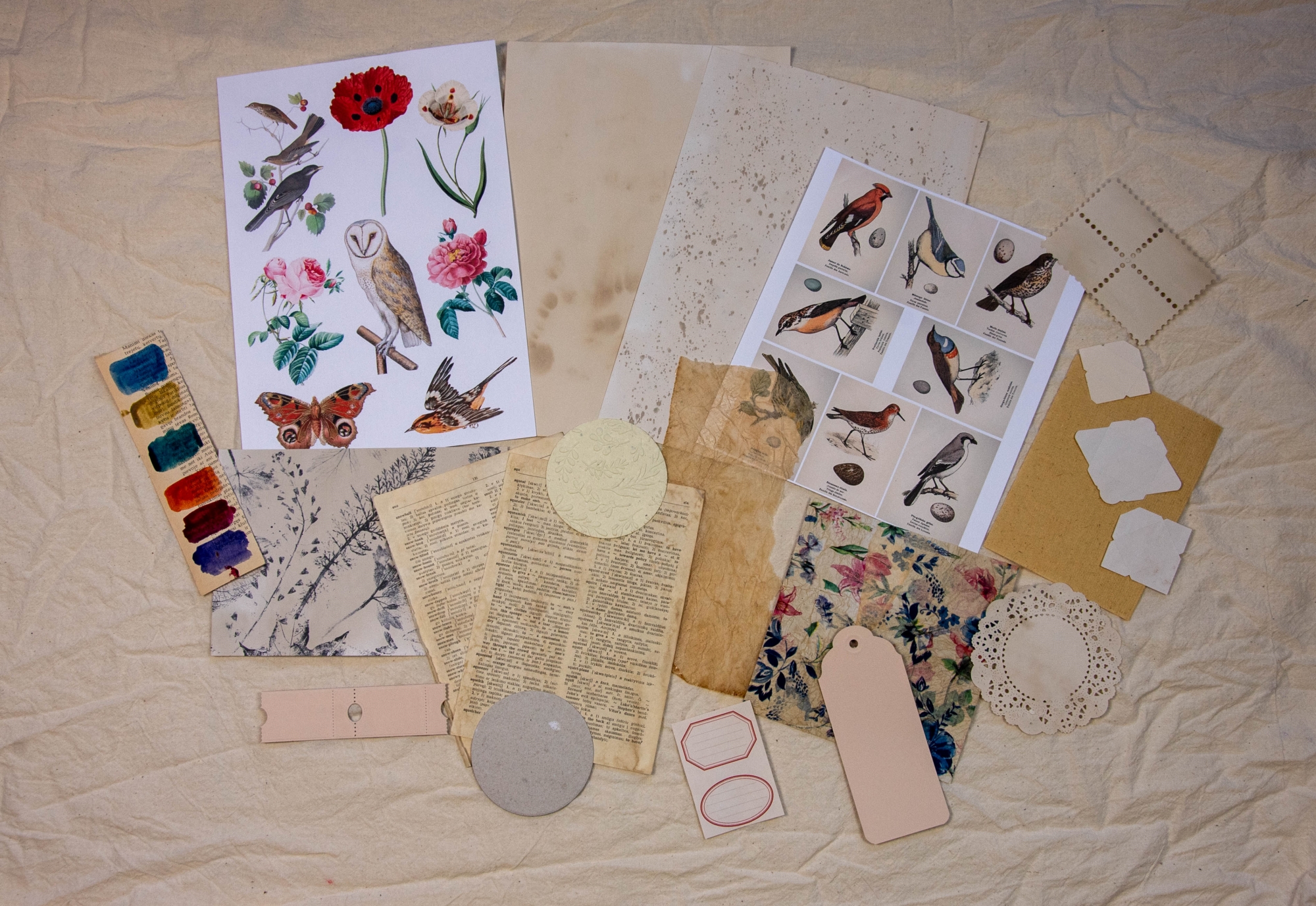 Rinkinyje rasite originalią cianotipiją, knygų lapų, printą, rankų darbo popieriaus, karpinių, skrebinimo popieriaus ir kt. gėrybių kūrybai.