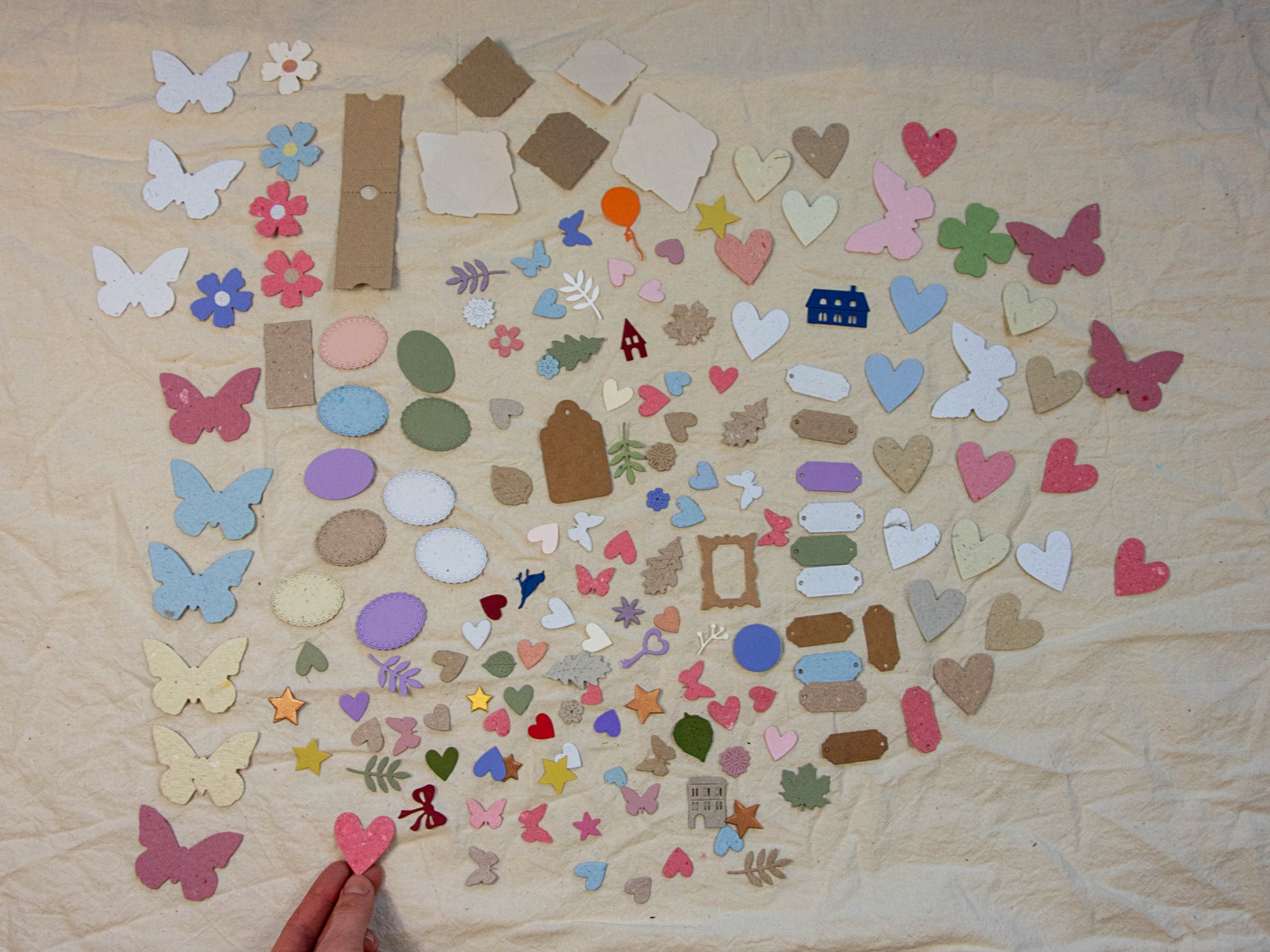 Jie pagaminti iš rankų darbo popieriaus ir kito popieriaus nuopjovų.
