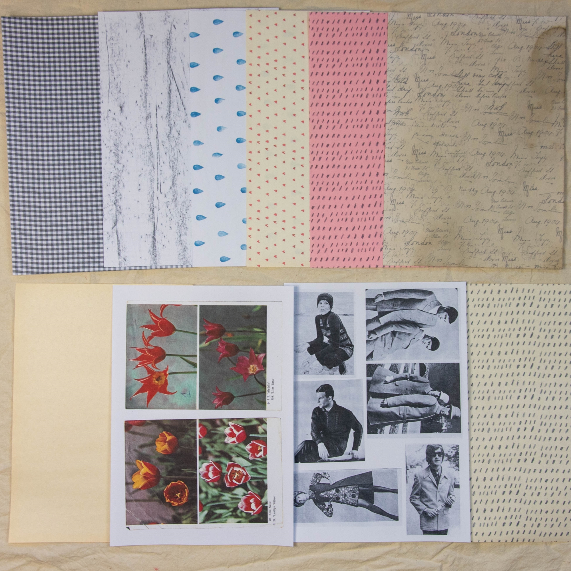 Rinkinyje rasite aštuoniolika lapų su spausdintomis vintažinėmis iliustracijomis (iš atvirų archyvų) ir nuotraukomis, kurias rinkau iš senų knygų, žurnalų. Taip pat yra lapų su nuskenuotais audiniais ir mano pieštais fonais, rankų darbo popieriaus, medvilninio popieriaus ,,debesėlis" ir kt. popierių. Viską galite pamatyti nuotraukose.
