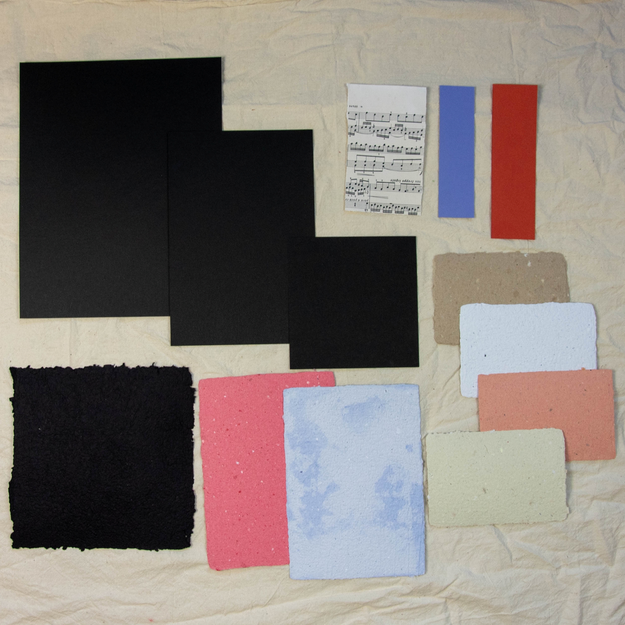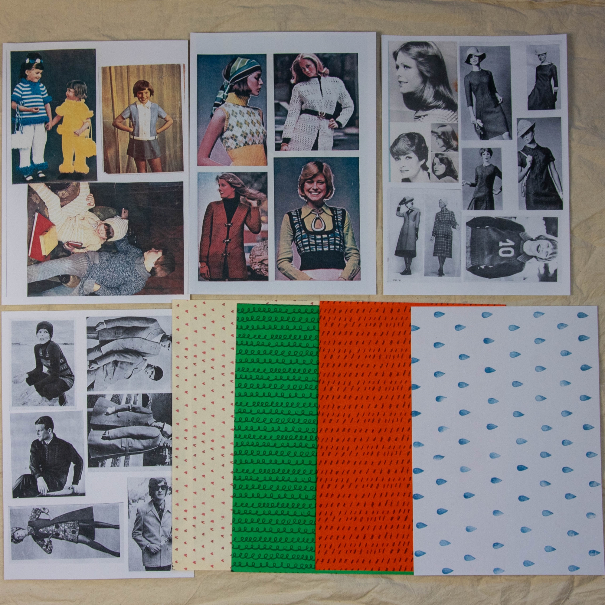 Rinkinyje rasite šešiolika lapų su spausdintomis vintažinėmis iliustracijomis (iš atvirų archyvų) ir nuotraukomis, kurias rinkau iš senų knygų, žurnalų. Taip pat yra lapų su nuskenuotais audiniais ir mano pieštais fonais, rankų darbo popieriaus, medvilninio popieriaus ,,debesėlis", tapybos darbų nuopjovos, karpiniai, juodo kartono koliažų pagrindams.
